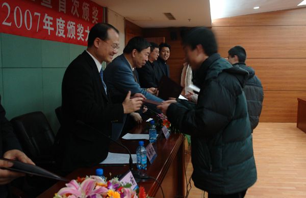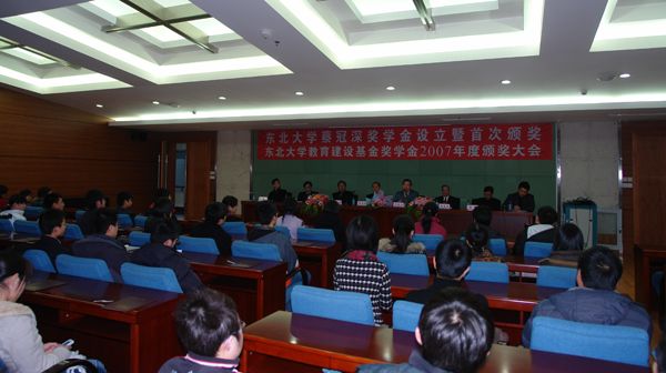 下午四时整,东北大学蔡冠深奖学金设立暨首次颁奖大会、东北大学教育建设基金奖2007年度颁奖大会在汉卿会堂402隆重召开。蔡冠深先生、香港新华集团中华区总经理余正生先生、沈阳新华实业有限公司副总经理崔彤先生、东北大学王宛山副校长、研究生院学生管理处处长刘宏林、学生工作处处长徐峰、校董会基金会管理办公室主任魏向前出席了颁奖大会。首先由东北大学校董会、基金会管理办公室主任魏向前向与会嘉宾和同学介绍了捐资方和东北大学蔡冠深奖学金设立的背景,并且宣读了东北大学蔡冠深奖学金管理委员会和评审委员会名单。魏向前介绍到,蔡冠深博士自1991年与其父和其他港商一起在香港创设了东北大学教育建设基金会(内地大学在香港创设的第一个大学教育基金会),便与东北大学建立了深厚友谊。1996年,在东北大学急需高素质人才的时候,蔡先生又出资设立东北大学蔡冠深奖励博士研究生基金,鼓励博士研究生留校任教以增强东北大学师资队伍的建设。2006年,蔡先生又慨允出任张学良教育基金会名誉理事,并慷慨捐资50万元人民币用于修建蔡冠深音乐厅。今年,蔡先生又应学校之建议,将东北大学蔡冠深奖励博士研究生基金更改为东北大学蔡冠深奖学金,用于奖励东北大学在籍的优秀学生。一直以来,蔡先生对东北大学的发展建设非常支持并且做出了非常大的贡献。