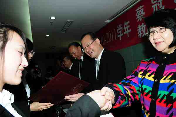 会见结束后,2010-2011学年东北大学蔡冠深奖学金、教育建设基金奖学金颁奖典礼在汉卿会堂402室举行。蔡冠深博士一行,我校党委书记孙家学,校党委副书记、纪委书记杨明等出席颁奖典礼。杨明宣读了2010-2011学年东北大学蔡冠深奖学金、教育建设基金奖学金的表奖决定。与会嘉宾共同为获奖学生颁奖。