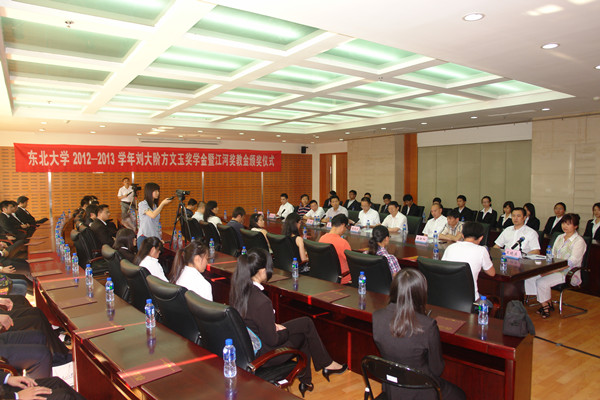 学校有关部门负责人介绍了东北大学刘大阶方文玉奖学金暨江河奖教金设立情况。学生处、人事处相关负责人分别宣读了2012-2013学年东北大学刘大阶方文玉奖学金获奖名单和2013年度江河奖教金获奖名单,王鑫等52名同学获得2012-2013学年刘大阶方文玉奖学金,张鑫等10名同志获得东北大学2013年度江河奖教金。