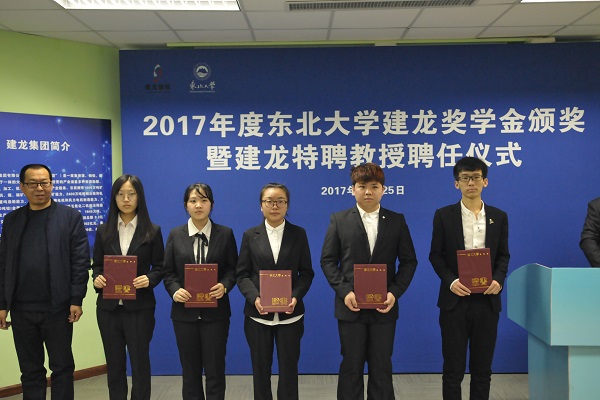 2017年度东北大学建龙奖学金颁奖暨建龙特聘教授聘任仪式在东北大学科学馆二楼会议室举行。张志祥、魏国栋、赵继、孙雷,以及外联处、创新创业学院、团委等相关部门负责人,建龙集团各子公司相关负责人参加颁奖仪式。