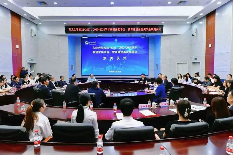 5月25日,东北大学2022-2023、2023-2024学年蔡冠深奖学金、教育建设基金奖学金颁奖仪式在综合楼824会议室举行。全国政协常委、香港中华总商会会长、粤港澳大湾区企业家联盟主席、京津冀环渤海企业家联盟主席、香港长三角企业家国际联盟主席、香港新华集团董事局主席蔡冠深博士,辽宁省政协常委、香港新华集团执行董事、东北及华北区总裁,香港新华科技集团总裁蔡隽思总裁携新华集团代表来访,东北大学校长、中国工程院院士冯夏庭,东北大学党委常委、副校长徐峰,相关部门负责人,往届奖学金获奖教师代表及获奖学生出席颁奖仪式。颁奖仪式由徐峰主持。